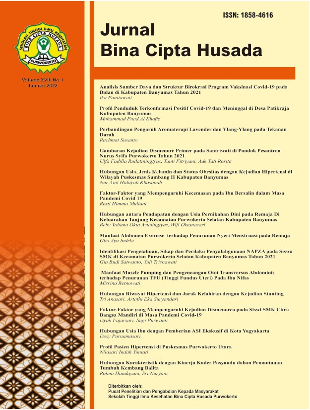 Jurnal Bina Cipta Husada hadir sebagai wadah kepenulisan bagi dosen-dosen STIKes Bina Cipta Husada pada Khususnya dan segenap civitas akademika di institusi baik rumpun kesehatan maupun science pada umumnya di luar lingkungan STIKes Bina Cipta Husada Purwokerto. Hadirnya jurnal Bina Cipta Husada ini diharapkan dapat menjadi dasar pertimbangan rasional dalam tanggung jawab institusi perguruan tinggi khususnya dalam menghadapi perkembangan ilmu dan pelaksanaan Tri Dharma Perguruan tinggi khususnya bagi para Dosen-dosen di perguruan tinggi.