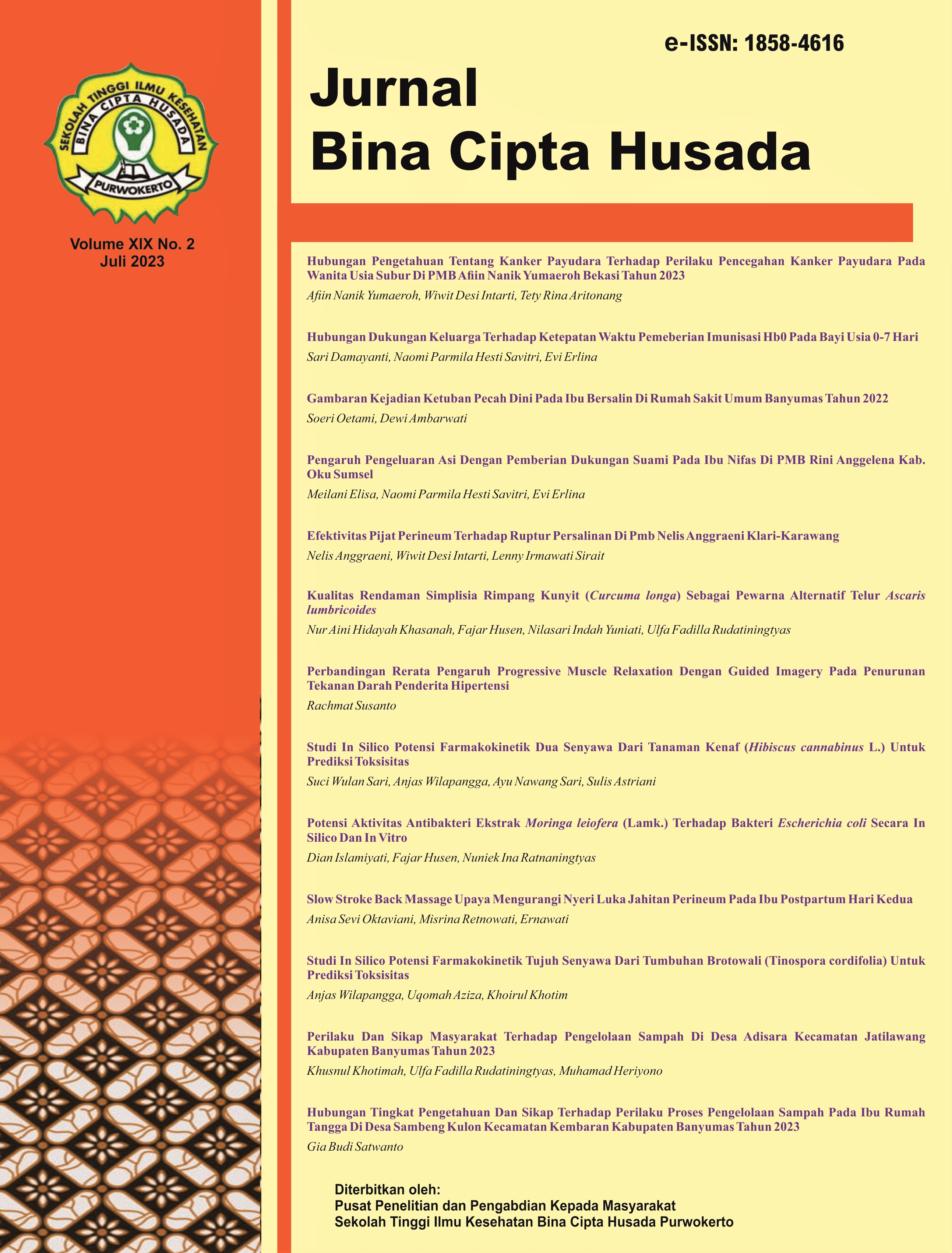 Syukur Alhamdulillah kita panjatkan kehadirat Allah SWT, atas ijin dan ridho-Nya kami dapat menyelesaikan “Jurnal Bina Cipta Husada Volume XXI Nomor 2 Bulan Juli 2025”. Jurnal Bina Cipta Husada juga sudah terindeks pada portal Garuda Kemenristek DIKTI, Directory Research Journal Indexing (DRJI), OneSearch PERPUSNAS Indonesia, Google Scholar, dan CiteFactor: Academic Scientific Journals.