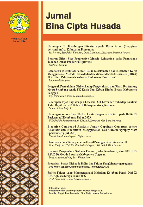 Syukur Alhamdulillah kita panjatkan kehadirat Allah SWT, atas ijin dan ridho-Nya kami dapat menyelesaikan “Jurnal Bina Cipta Husada Volume XX Nomor 1 Bulan Januari 2024”. Jurnal Bina Cipta Husada juga sudah terindeks pada portal Garuda Kemenristek DIKTI, Directory Research Journal Indexing (DRJI), OneSearch PERPUSNAS Indonesia, dan CiteFactor: Academic Scientific Journals.